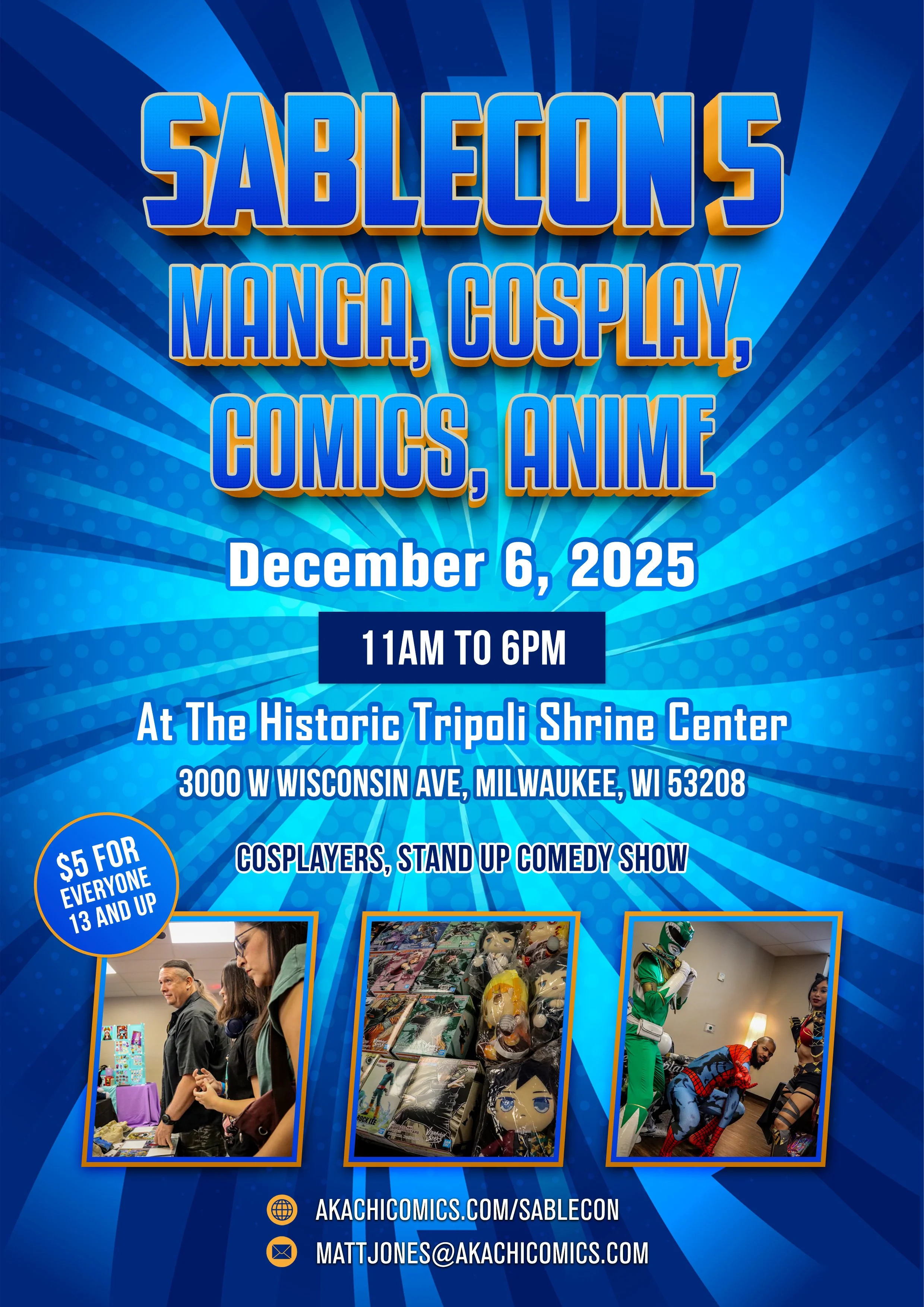 Attention manga and comic book fans - your dreams have come true! SABLE CON is a manga, comic, and anime convention, happening on December 6, 2025, at the Tripoli Shrine Center in Milwaukee, Wisconsin! If you love manga, anime, and the idea of a unique convention experience inspires an indescribable feeling inside, this event is for you! Come meet amazing indie artists, manga/comic creators and be part of something special.